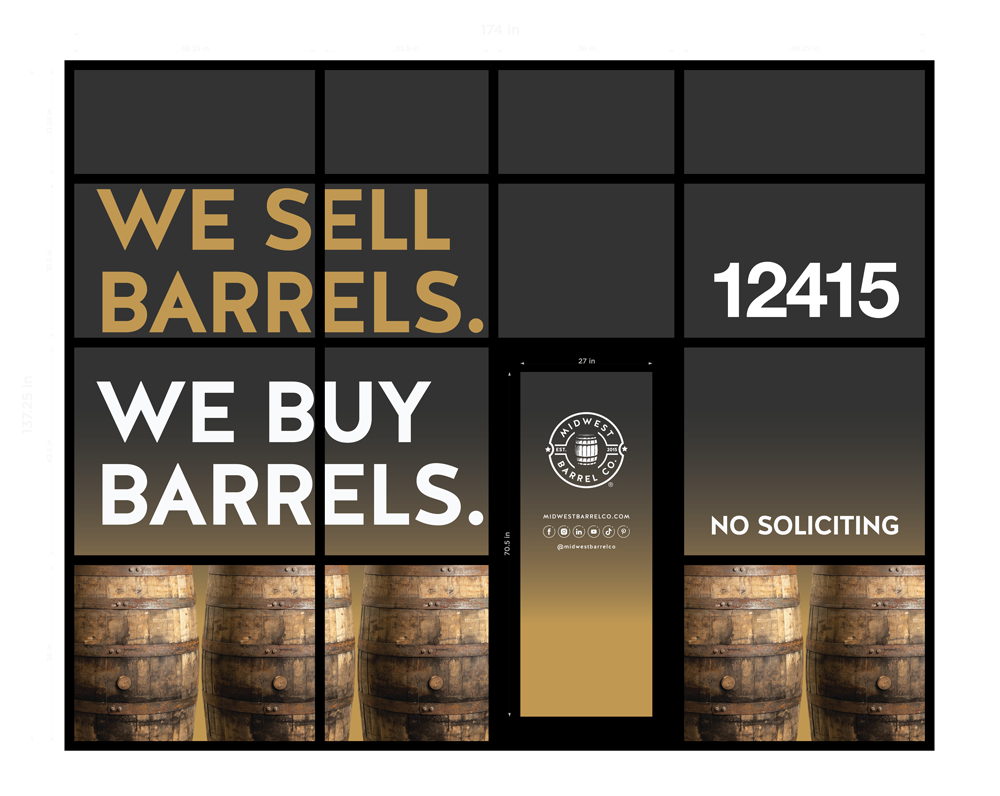 I designed exterior and interior signage for the Midwest Barrel Co. building, translating the brand into physical space.